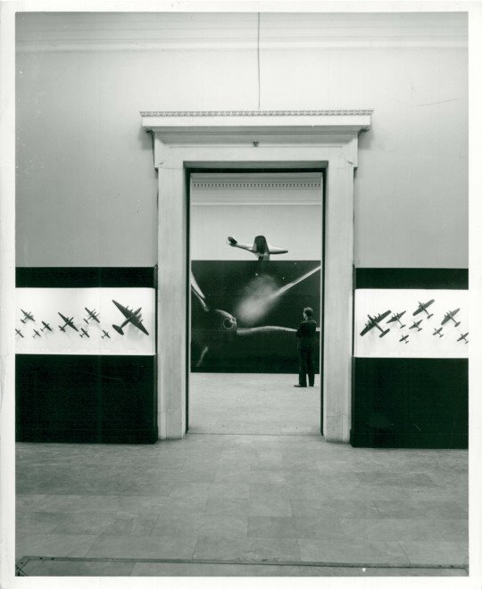 Organized by the Albright Art Gallery in cooperation with the Bell Aircraft Corporation, the exhibition comprised photo-enlargements showing the development of the Airacobra airplane from drafting board to flight. Beginning with the full-scale outline, significant steps in the making of the plane were pictured, from the preparation of the parts for the assembly line to the point where the plane rolls onto the field for testing. A series of flight shots, views of the plane being created and shipped, and finally performance in foreign fields completed the exhibition.