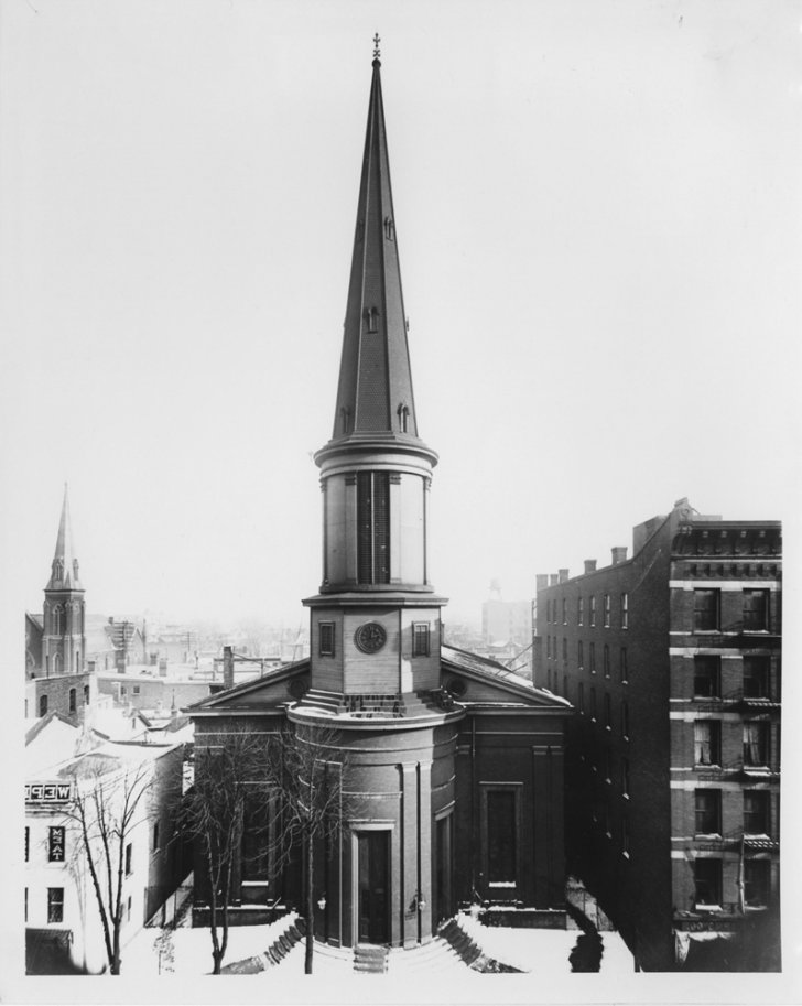 The first services held at the church occurred on October 3, 1847, and the dedication ceremony was on December 29, 1847. In 1904, the church was demolished for the construction of the Hippodrome Theater, which opened in 1914. Designed by Leon H. Lempert, Jr., the Hippodrome was Michael Shea’s first movie theater. The building was demolished in 1983 and the location is now the site of Fountain Plaza.
