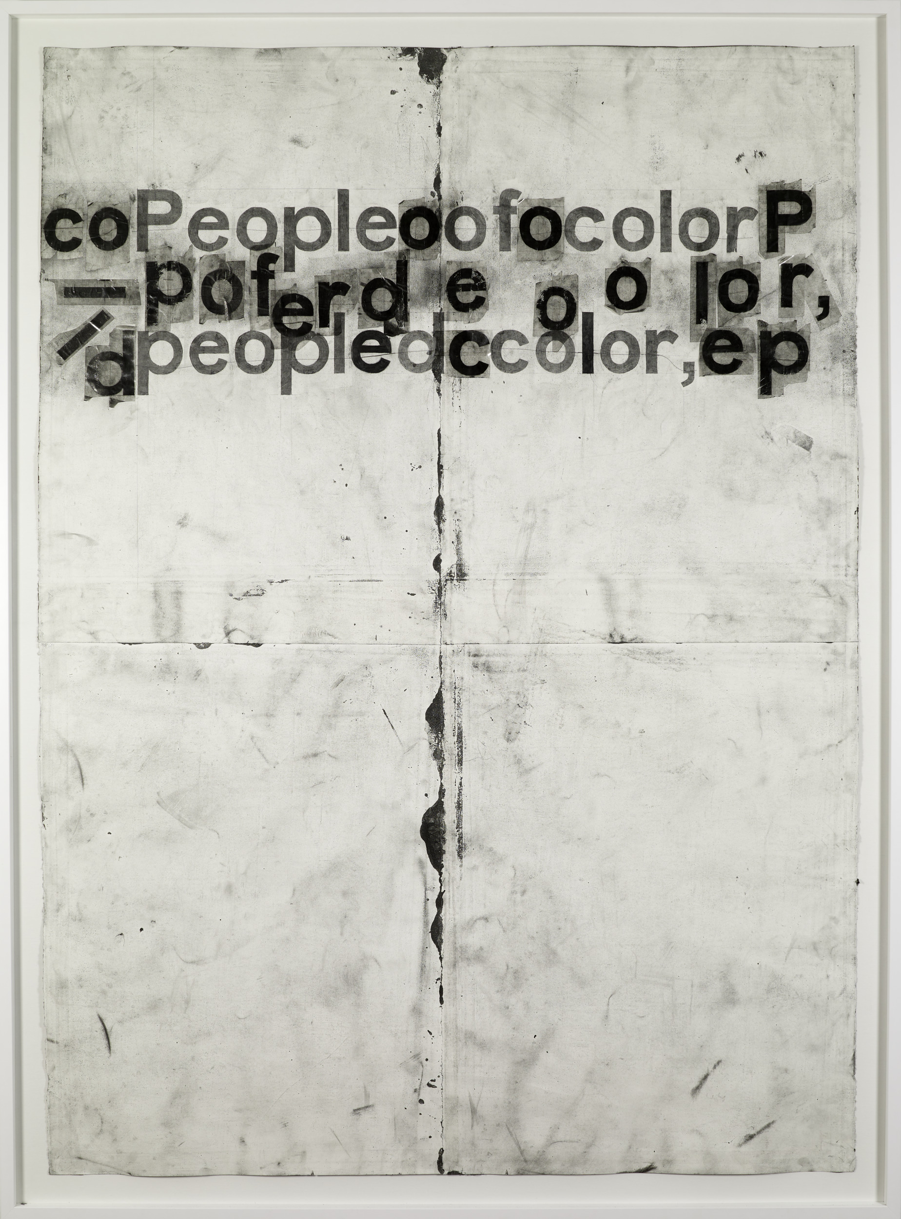 In Tony Lewis’s drawings, bits of language are arranged in the tradition of concrete poetry, which treats letters and words as visual forms instead of units of communication. For example, Lewis routinely jumbles letters, erases parts of phrases, and multiplies words on top of each other—all of which encourages us to appreciate language as a kind of visual art. Still, in some cases, as in Poferd, it is possible to pick out words that resonate with linguistic meaning. Far from incidental, the words “people of color”—recombined here with other letters to make new nonsensical words, such as “poferd”—evoke the history of race relations in America, particularly Jim Crow–era signs announcing that “colored people” were not welcome. By both drawing our attention to and transforming these words, Lewis underscores the power of language to shape our identities and questions how the meaning of these particular words has changed.