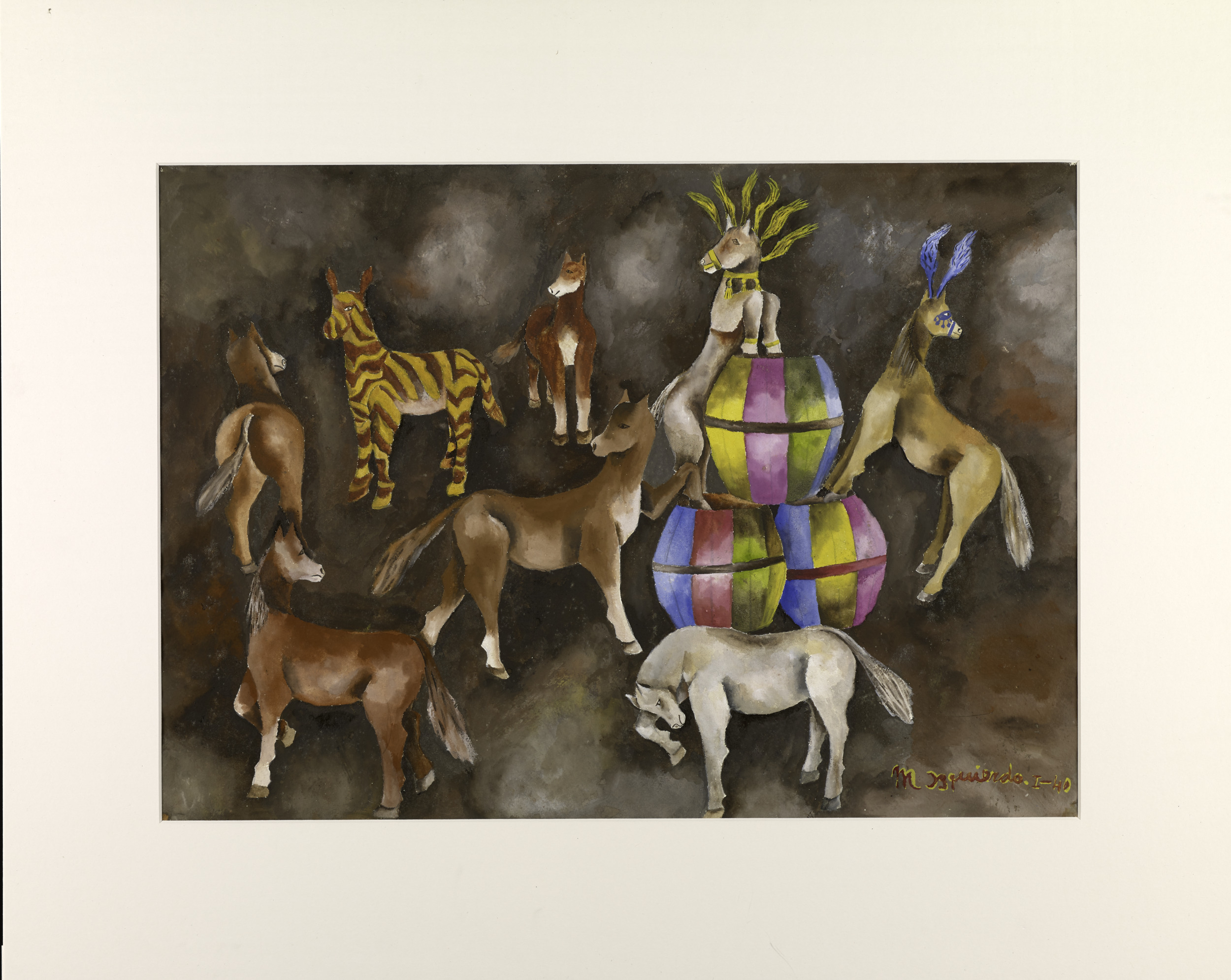 In 1923, María Izquierdo moved with her family to Mexico City, where she was inspired by the region’s artistic culture. There, she studied with prominent Mexican artists Diego Rivera and Rufino Tamayo, who strove to harness the political ideals of the Mexican Revolution (1910–20) in their murals. Although Izquierdo shared Rivera and Tamayo’s core values, she sought to implement them in a more universal language that was less propagandistic, often reinterpreting Mexican folklore and traditions in a primitive style and bright color palette. Art became an essential means of personal communication for the artist. One of her favorite subjects was the circus, which is the main theme of Horse Actors. Izquierdo often went to performances with her aunt and grandmother as a young girl, and such images reminded her of them.
