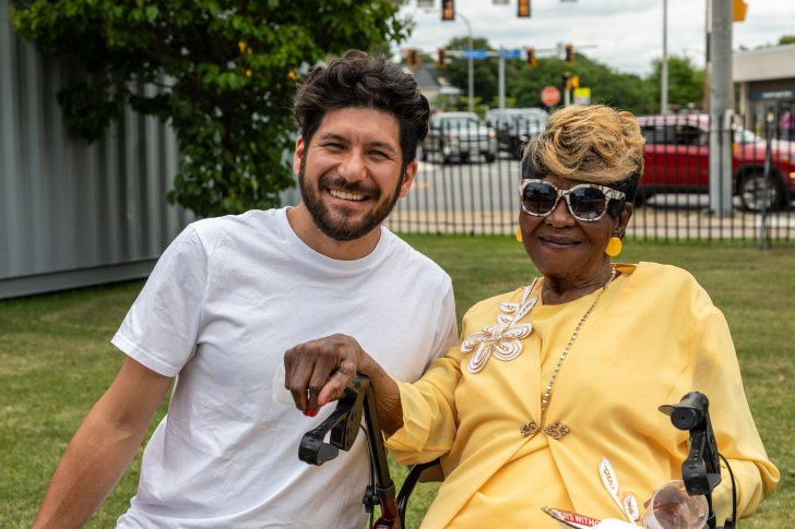 Aaron Li-Hill with LBJ Resident Miss Mary. Photo: Jeff Mace for Buffalo AKG Art Museum