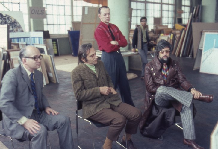 Former Cleveland Museum of Art Chief Curator of Modern Art Edward Burk Henning, artist Allan D'Arcangelo, and artist James N. Wines selecting artworks for In Western New York 1969 in October 1969. Image courtesy of the Albright-Knox Art Gallery Digital Assets Collection and Archives, Buffalo, New York.