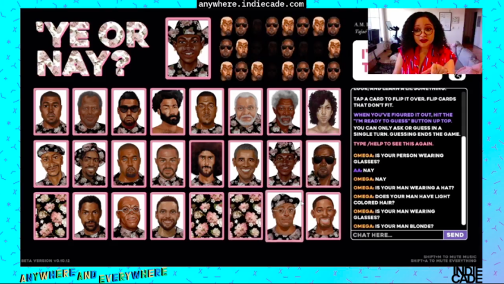 A.M. Darke (he/him/his/she/her/hers) modeled this online game after the classic board game “Guess Who?” In both, players take turns trying to guess the other player’s character by asking questions about their identity and appearance, such as, “Is it a man?” or “Are they wearing a hat?” In Darke’s game, however, all of the characters are Black male celebrities, and many are Kanye West at various stages of his career, as indicated by the pun in the work’s title.