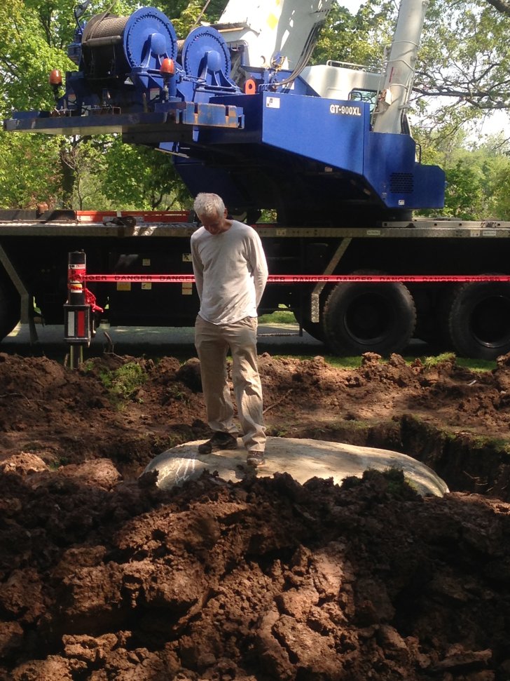 Andy Goldsworthy oversees installation of his work Rising Stone, 2013, on the Albright-Knox's grounds in 2013. Photograph by Laura Brill.