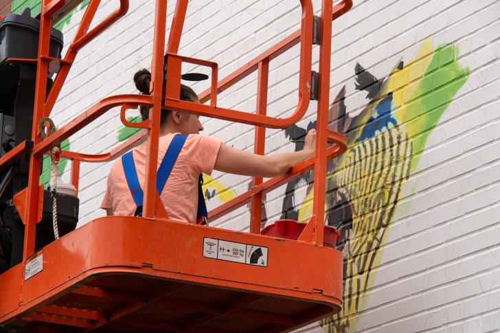 Augustina Droze working on her mural at 2302 Main Street. Photograph by Tom Loonan.