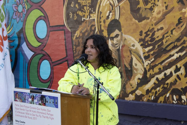 Betsy Casañas speaking at the dedication of her AK Public Art mural, Patria, Será Porque Quisiera Que Vueles, Que Sigue Siendo Tuyo Mi Vuelo (Homeland, Perhaps It Is Because I Wish to See You Fly, That My Flight Continues To Be Yours), on August 25, 2017. Photograph by Tom Loonan.