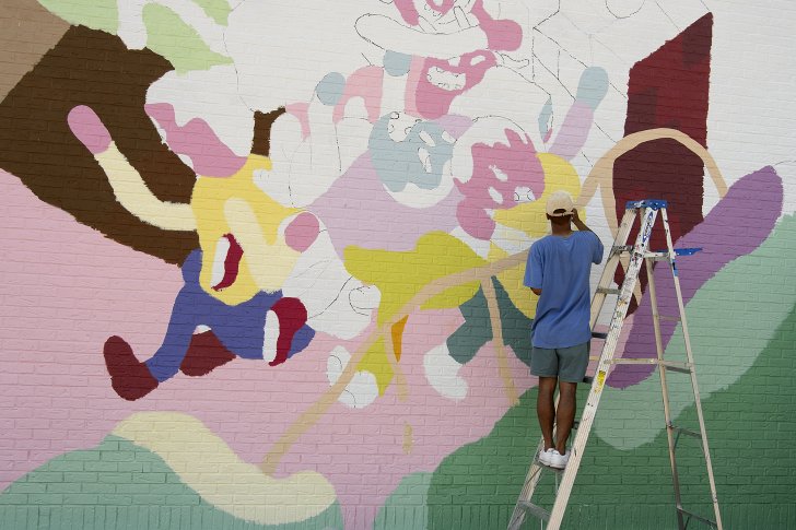 Artist Bradd Young, aka SALUT, working on his mural Teamwork for the Cobblestone Commons mural project. Photograph by Tom Loonan.
