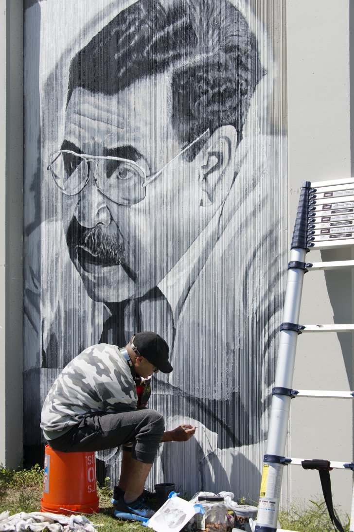 Chuck Tingley working on a portrait of George K. Arthur for The Freedom Wall. Photograph by Tom Loonan.