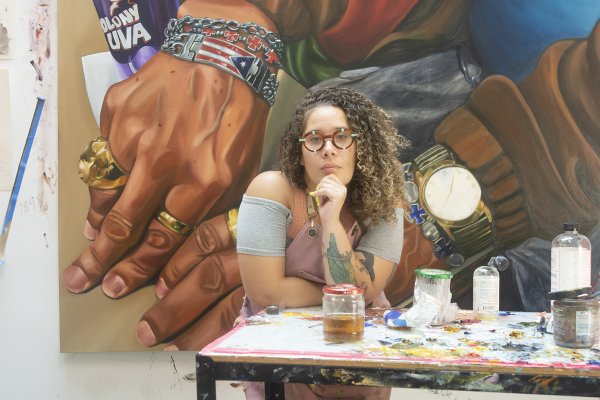 Danielle De Jesus (b. 1987) is a Nuyorican painter and photographer born and raised in Bushwick, Brooklyn, whose works tell the story of growing up in New York City amid gentrification and displacement. De Jesus’s background is in photography, and she utilizes her images of the people native to Bushwick as a reference to tell the story of the community’s displaced residents. De Jesus’s work has been included in prominent group shows at the Akron Art Museum, Ohio (2022), and at MoMA PS1, New York. Her paintings are held in the permanent collections of the Pérez Art Museum Miami; El Museo del Barrio, New York; and the Whitney Museum of American Art, New York.