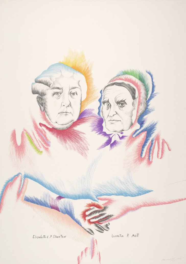 Marisol (Venezuelan and American, born France, 1930–2016). Women's Equality from Kent Bicentennial Portfolio: Spirit of Independence, 1975. Lithograph in fifteen colors on Arches Cover paper, edition 40/125 plus 10 artist's proofs, 34 1/2 x 29 3/4 inches (87.6 x 75.6 cm). Collection Albright-Knox Art Gallery, Buffalo, New York; Gift of Lorillard Company, 1975 (P1975:9.9). © Estate of Marisol / Albright-Knox Art Gallery / Artists Rights Society (ARS), New York / P. Lorillard's Company Trademark used with permission of P. Lorillard Company