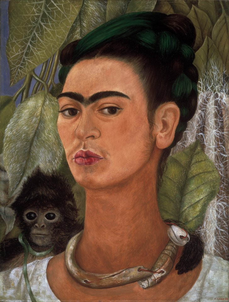 Frida Kahlo (Mexican, 1907-1954). Self-Portrait with Monkey, 1938. Oil on Masonite, 16 x 12 inches (40.7 x 30.5 cm). Collection Albright-Knox Art Gallery, Buffalo, New York; Bequest of A. Conger Goodyear, 1966 (1966:9.10). © Banco de Mexico Diego Rivera Frida Kahlo Museums Trust, D.F. / Artists Rights Society (ARS), New York