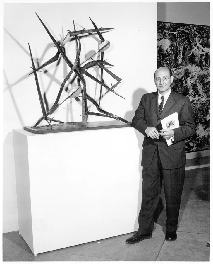 Artist Herbert Ferber with his work Green Sculpture II, 1954, at the Members Opening for Contemporary Art Acquisitions, 1954–1957 on May 15, 1957. Photograph by The Towne Studio, Buffalo, New York. Image courtesy of the Albright-Knox Art Gallery Digital Assets Collection and Archives, Buffalo, New York.