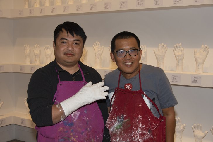 Htein Lin (right) with a member of Buffalo's Burmese community, whose hand he cast on April 7, 2019. Photograph by Tom Loonan.