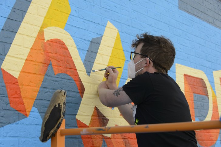 James Moffitt, aka YAMES, working on his mural Practice for the Cobblestone Commons mural project. Photograph by Tom Loonan.