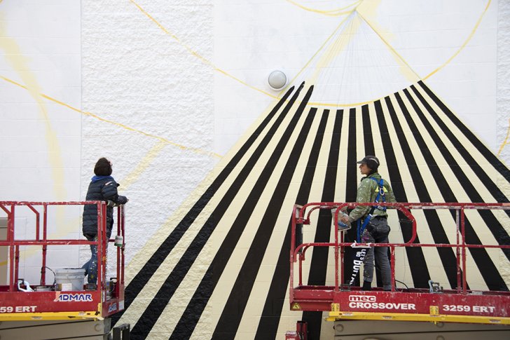 Jessie and Katey working on the mural Noodle in the Northern Lights, 2016. Photograph by Tom Loonan.