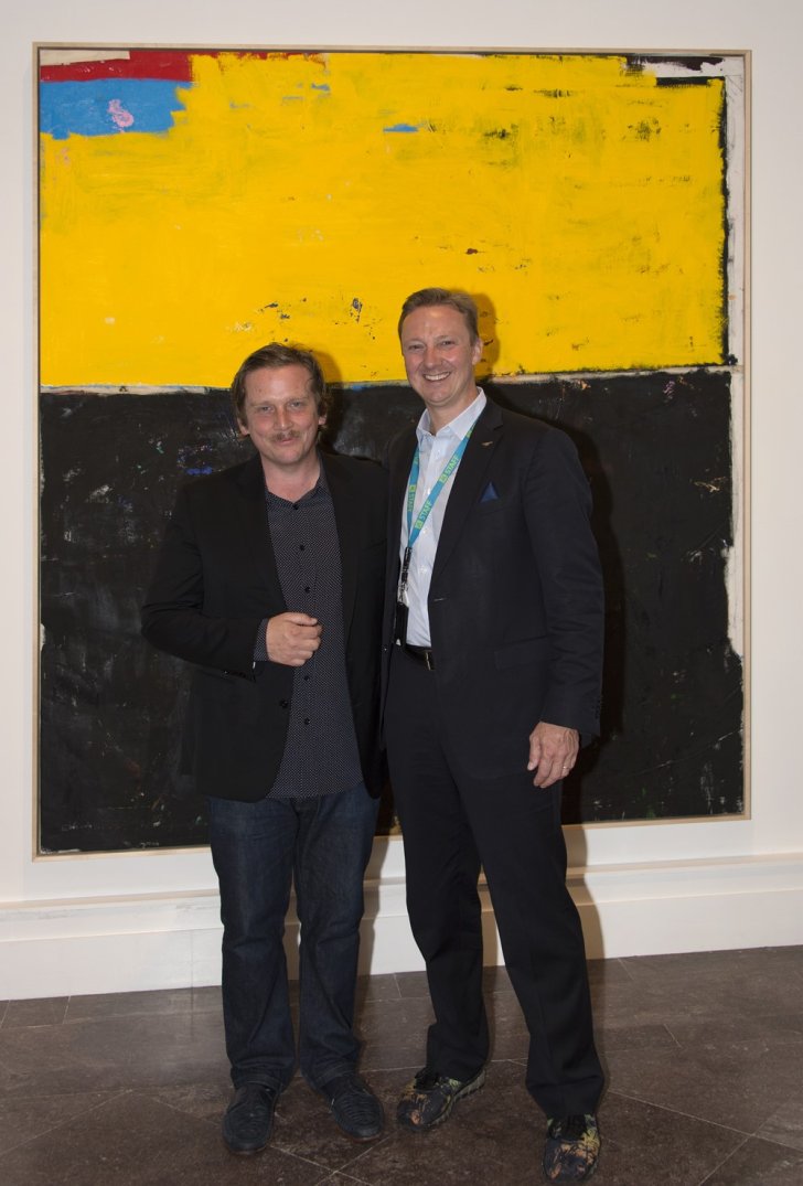 Joe Bradley (left) with Peggy Pierce Elfvin Director Janne Sirén in front of Bradley's Good World, 2017 (Collection Albright-Knox Art Gallery). Photograph by Tom Loonan.