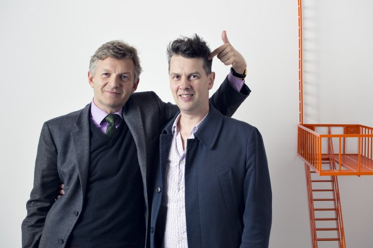 Anton Kern and John Bock (right) at the gala celebrating DECADE: Contemporary Collecting 2002–2012. (Sarah Sze's Second Means of Egress (Orange), 2004, is on the right.) Photograph by Luke Copping.