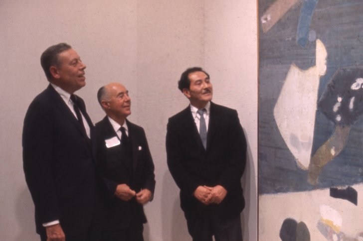 Albright-Knox Director Gordon Smith, Seymour H. Knox, Jr., and artist Kenzo Okada with Okada’s Dynasty, 1956, at the Members' Opening of Kenzo Okada on October 18, 1965. Image courtesy of the Albright-Knox Art Gallery Digital Assets Collection and Archives, Buffalo, New York.