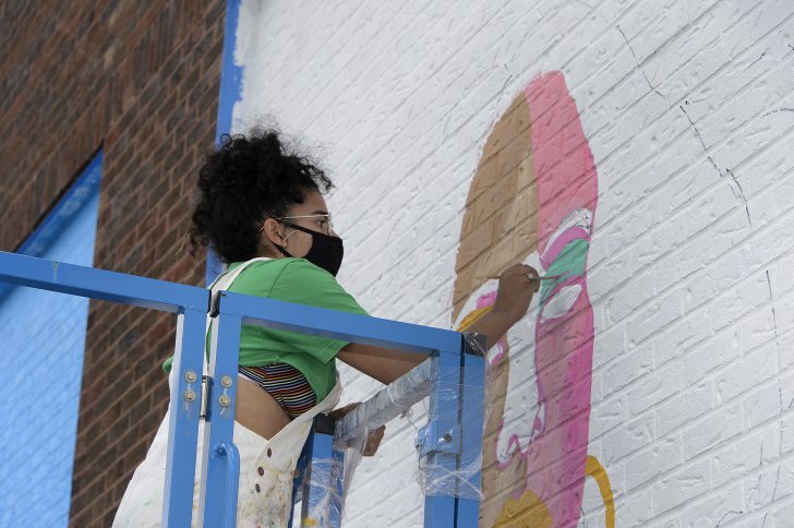 Artist Lauren Mckenzie-Pearce working on her mural An Artist & A Drummer for the Cobblestone Commons mural project. Photograph by Tom Loonan.