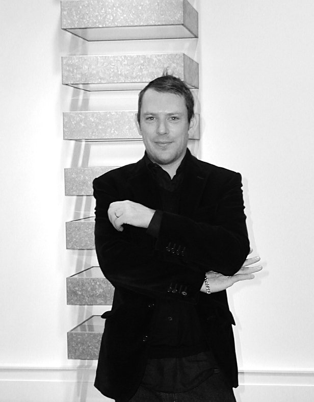 Liam Gillick with Donald Judd's Untitled, 1969, at the museum on March 1, 2004. Photograph by Tom Loonan.