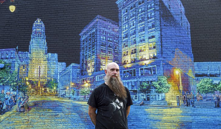Logan Hicks in front of his mural on the Washington Street façade of 5 East Huron Street in Buffalo.