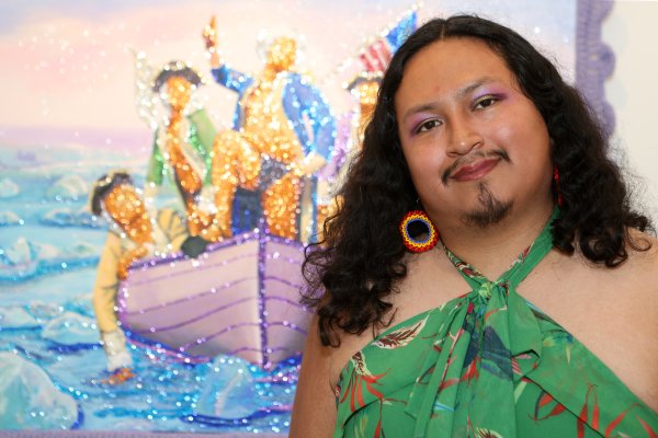 Moises Salazar (b. 1996) was raised and is based in Chicago. Salazar has stated, “My existence as a nonbinary first-generation Mexican American creates a state of conflict within my identity, and this tension is the most prevalent influence in my practice.” Inspired by fashion and drag culture, Salazar uses embellishments, fabrics, and textures combined with traditional Mexican craft techniques in conceptual and installation-based work. Salazar has exhibited nationally and internationally, including at WOAW Gallery, Hong Kong; Salón ACME 8, Mexico City; and the MCA Chicago. An inaugural solo exhibition opened at Mindy Solomon Gallery, Miami, in 2021. Salazar’s work has been featured in The Hispanic Executive, Artnet, and Hyperallergic. Salazar has been a resident in The Hyde Park Art Center Residency, Chicago, and is a recipient of the Luminarts Foundation Arts Fellowship, the 3Arts Make a Wave Grant, and a finalist for the QUEER|ART|PRIZE.