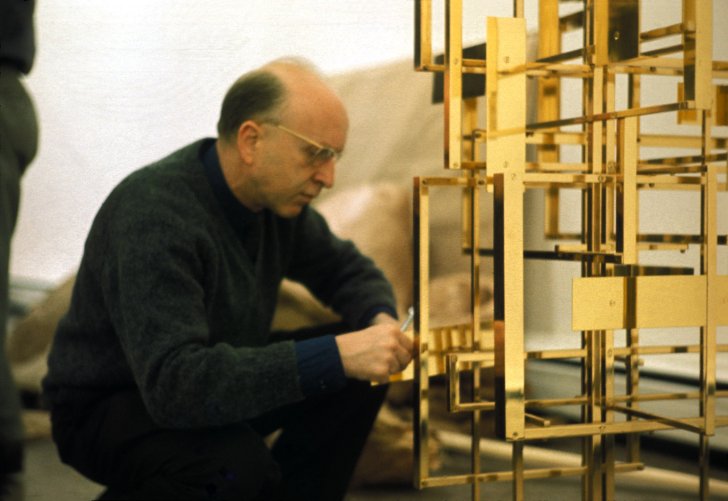 Nicolas Schöffer installing his work Spatiodynamique 22, 1954, for Art Today: Kinetic & Optic at the Albright-Knox Art Gallery in February 1965. Image courtesy of the Albright-Knox Art Gallery Digital Assets Collection and Archives, Buffalo, New York.