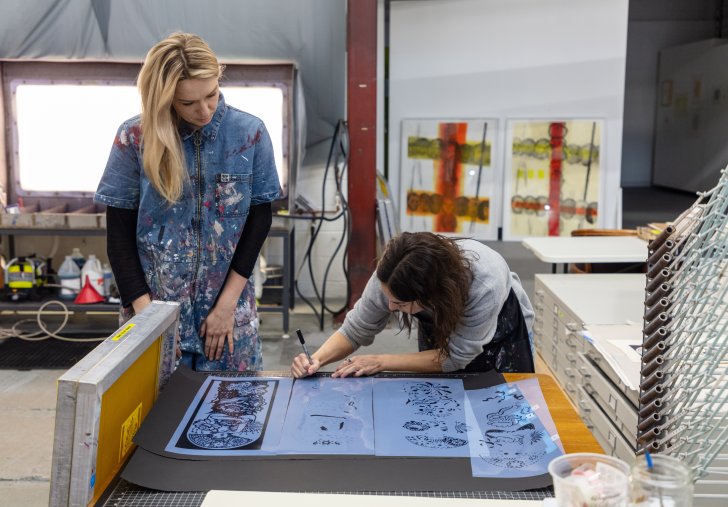 Artists Ola Volo and Rachel Shelton working at Mirabo Press. Photo: Jeff Mace