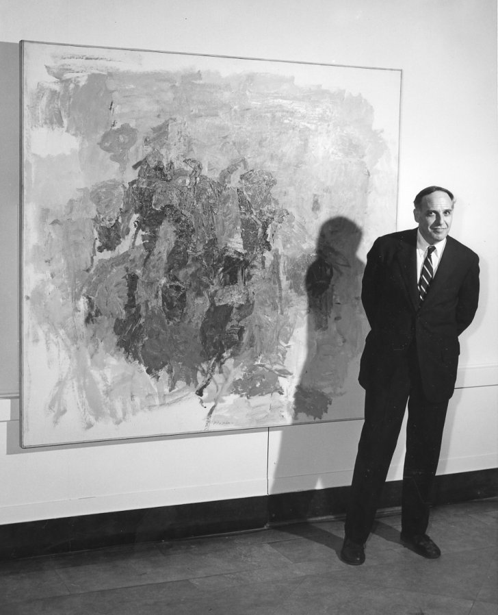 Philip Guston in front of his work Voyage, 1956, at the Members’ Preview for Contemporary Art: Acquisitions 1954–1957 on May 15, 1957. Photograph by The Towne Studio, Buffalo, New York.