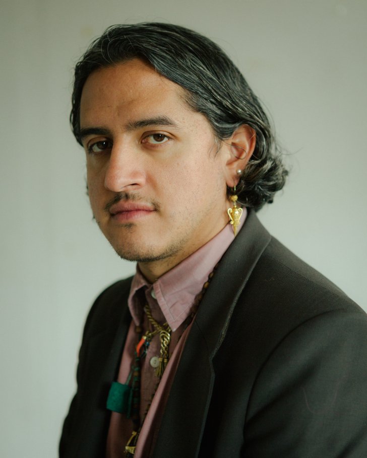Raúl De Nieves, a New York City-based artist born in Mexico, produces faux stained-glass windows using mundane materials such as cellophane and tape, then populates his colorful and luminous spaces with elaborate human-scaled costumes made out of densely layered beads.