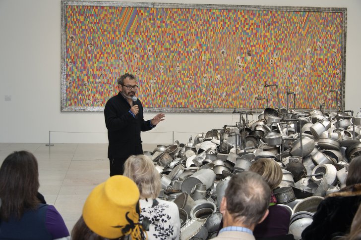 Subodh Gupta gives a Gallery Talk with his work This is not a fountain, 2011–13, in We the People: New Art from the Collection on November 10, 2018. Photograph by Tom Loonan.
