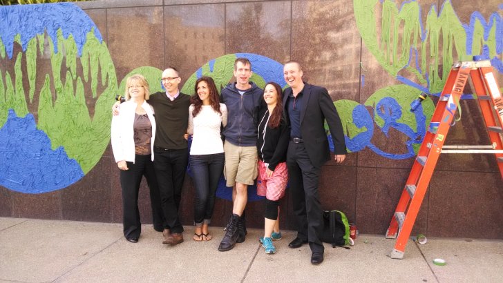 Buffalo & Erie County Public Library System Director Mary Jean Jakubowski, Albright-Knox Curator of Public Art Aaron Ott, Tape Art Executive Director Kristen Carbone, Tape Art Founder and Creative Director Michael Townsend, Tape Art Artist Leah Smith, and Albright-Knox Director Janne Sirén in front of Buffalo Caverns, 2014, at the Central Library. Photograph by Pamela Martin.