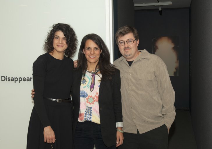 Albright-Knox Curator Heather Pesanti and virocode (Andrea Mancuso and Peter D’Auria) at the opening of Full Color Depression: First Kodachromes from America’s Heartland, Victoria Sambunaris: Taxonomy of a Landscape, and Virocode: A Disappearance of the Source on October 21, 2012.