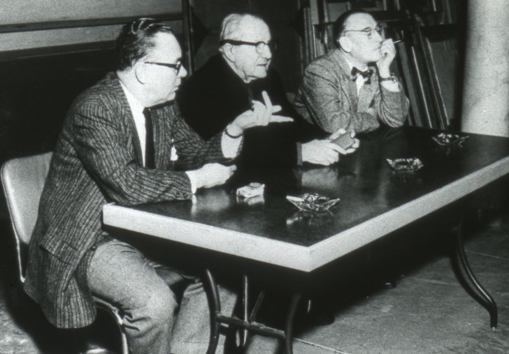 Worchester Art Museum Director Daniel Catton Rich, artist Hans Hoffman, and artist Zoltan L. Sepeshy select artworks for inclusion in the In Western New York 1959 exhibition on February 4, 1959. Image courtesy of the Albright-Knox Art Gallery Digital Assets Collection and Archives, Buffalo, New York.