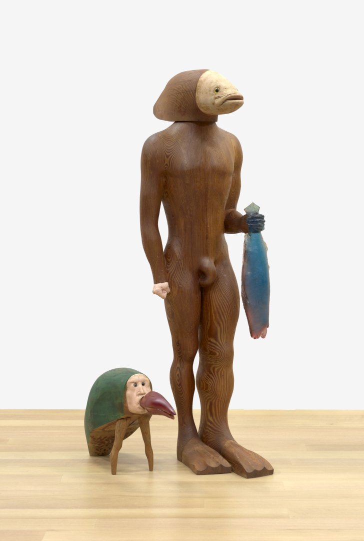Marisol (Venezuelan and American, born France, 1930–2016). The Fishman, 1973. Wood, plaster, acrylic paint, resin, and glass eyes. 68¼ x 28 x 33¼ inches (173.4 x 71.1 x 84.5 cm). Collection Buffalo AKG Art Museum. Bequest of Marisol, 2016 (2021:37a–g). © Estate of Marisol / Artists Rights Society (ARS), New York