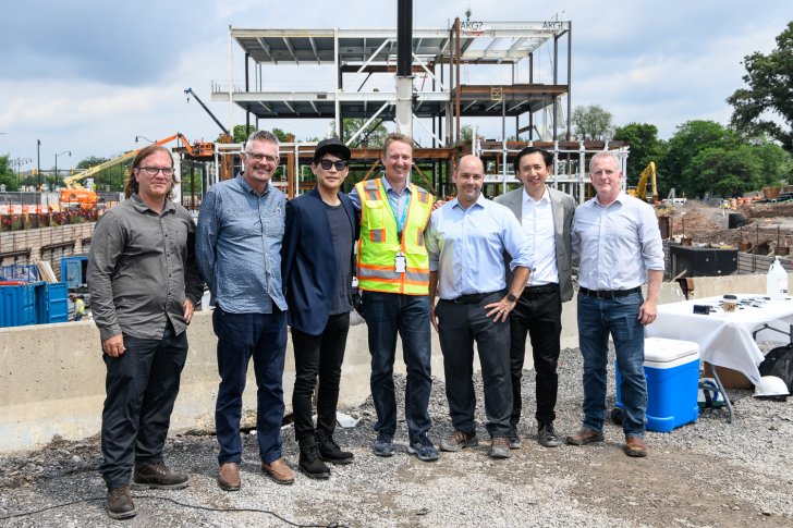 Shohei Shigematsu (third from left), Peggy Pierce Elfvin Director Dr. Janne Sirén (center), Director of Facilities Jamie Robideau (right), and the OMA team at the Topping Out Ceremony for the new Jeffrey E. Gundlach Building designed by OMA on July 7, 2021. Photo: Jeff Mace for Buffalo AKG Art Museum